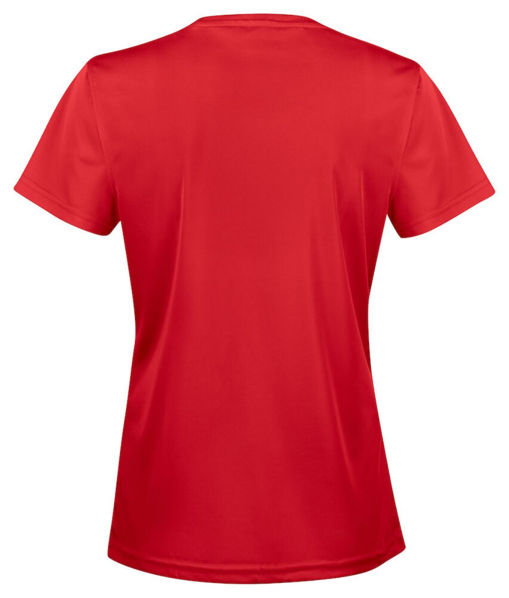 Denna funktionella dam-T-shirt är tillverkad av spun-dyed polyester och har en rund hals med förstärkt, ribbad halslinning och nackband för extra slitstyrka. Den avancerade funktionsmaterialet transporterar snabbt bort fukt från huden, vilket gör att plagget torkar snabbt och håller dig torr och fräsch hela dagen. Dessutom är den krymp- och skrynkelfri, vilket gör den till en pålitlig och bekväm följeslagare i vardagen.