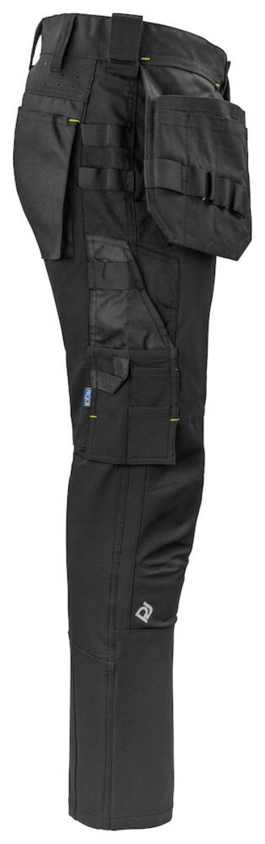 Byxan är utrustad med en mängd olika fickor för att underlätta organisation och snabb åtkomst av dina verktyg. På vänster sida finns en multifunktionell ficka med plats för verktyg och penna, samt en mobilficka med säkert magnetlås och ett praktiskt fäste för ID-kortshållare. På höger sida finns en dedikerad tumstocks- och verktygsficka med en extra säker knivknapp för ökad säkerhet.