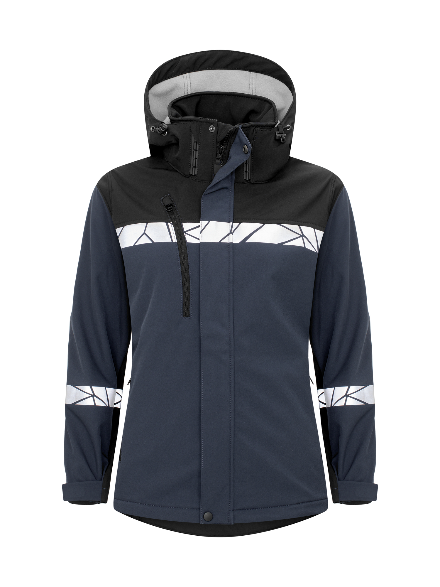 Jacka i funktionellt softshellmaterial som är vind- och vattenavvisande. Dragkedja framtill med utvändig vindslå för att förhindra vinddrag. Bröstficka på höger sida med invändigt fäste för id-kort samt sidfickor på båda sidor, samtliga fickor försluts med dragkedja. Öppna innerfickor. Avtagbar, reglerbar huva. Reglerbar midja med snodd, reglerbara ärmslut med kardborre. I den inre vänstra sidosömmen finns en tvättchipficka.